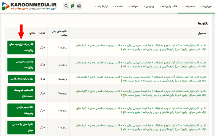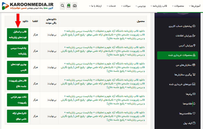 بلافاصله پس از ثبت سفارش، پرداخت هزینه و بازگشت به سایت، لینک دانلود اختصاصی محصول به شما نمایش داده میشود. با کلیک بر روی دکمههای سبز رنگ مانند تصویر زیر میتوانید فایل محصول را دانلود کنید.