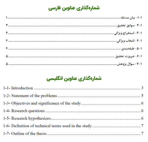 نمونهای از شمارهگذاری عناوین فصل اول پایاننامه به فارسی و انگلیسی