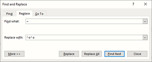 برای اصلاح آن کافی است، کاراکتر اِلشکل را کپی کرده، کلیدهای ترکیبی Ctrl+H را کلیک کنید تا کادر Find and Replace باز شود. در کادر Find what، کاراکتر اِلشکل را Paste کنید و در کادر Replace with، کاراکترهای ^o^o را قرار دهید و سپس دکمه Replace All را فشار دهید تا نیمفاصله استاندارد جایگزین شود.