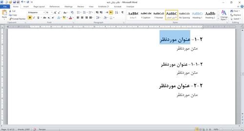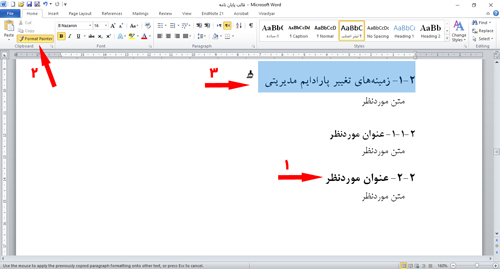 برای آموزش این مطلب یک مثال میزنیم. فرض کنید میخواهید عنوان 2-1 متن خود را به قالب آماده منتقل کنید. برای این کار یا عنوان را تایپ کرده و جایگزین عنوان پیشنهادی در قالب میکنید یا عنوان را از فایل خود Copy و در قالب آماده Paste میکنید و سپس با استفاده از ابزار Format Painter نرمافزار Word، استایل مربوطه را از عنوان مشابه، مثلاً عنوان اصلی بعدی، به متن خود منتقل میکنید.