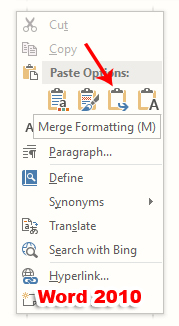 در این حالت برای گزینه پیست (Paste) چهار حالت فعال میشود که باید گزینهای که شبیه فلش آبی رنگ است را انتخاب کنید. وقتی اشارهگر ماوس را روی آن نگه میدارید متن Merge Formatting (M) زیر آن نمایش داده میشود. با کلیک بر روی آن، عنوان متن شما به قالب آماده منتقل میشود.