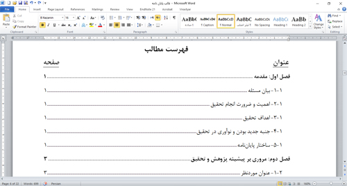 تنظیم فهرست مطالب، آخرین مرحله در نگارش، تدوین یا ویرایش پایاننامه است و باید به روش اتوماتیک ایجاد شود.